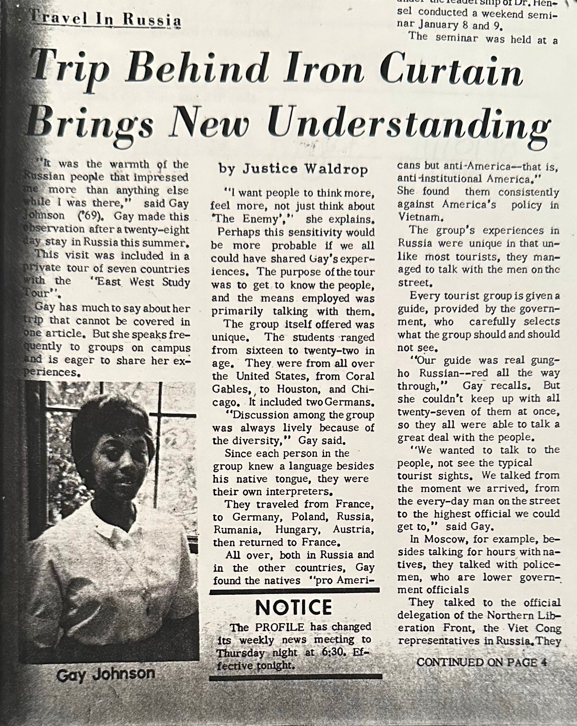 She appeared once, in the student newspaper—a photograph at the bottom of the page, maybe two inches by two and a half. She’d spent the summer in Russia.